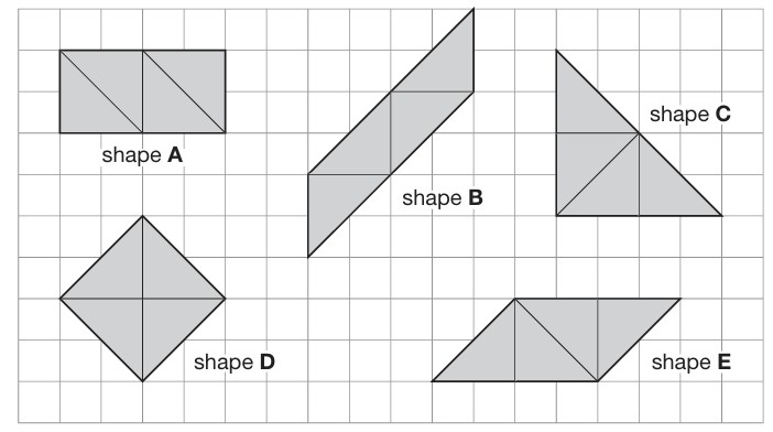 Joe makes different shapes using four tiles each time. The square grid shows the different shapes he makes.