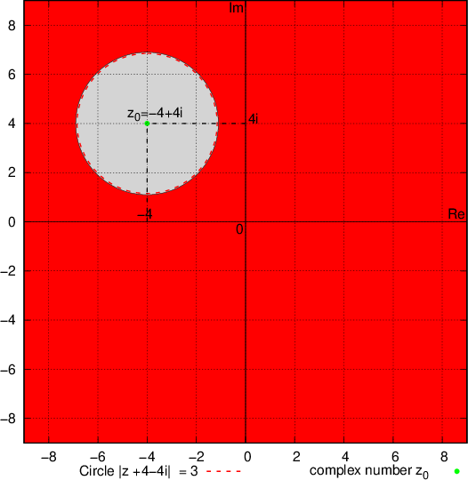In this case, due to the inequality sign ">", the required region is outside of the circle with centre in and radius r = 3 (marked in red in the picture), without including the circle (the circle is therefore drawn with dashes).