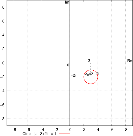 In this case (sign ), the required region is the inside of the circle with centre in and radius r = 1 including circle (circle is therefore drawn with a solid line):