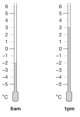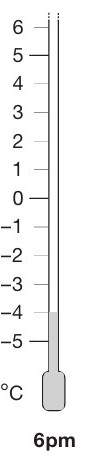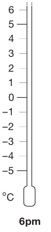 From 1 pm to 6 pm, the temperature went down by . Shade the thermometer below to show the temperature at 6 pm.