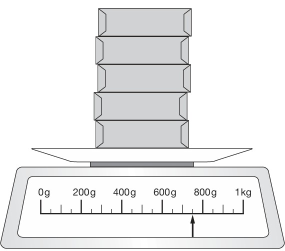 The scale shows how much five parcels weigh. All the parcels weigh the same. How much does one parcel weigh?