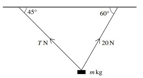 A block of mass is held in equilibrium below a horizontal ceiling by two strings, as shown in the diagram. One of the strings is inclined at to the horizontal and the tension in this string is . The other string is inclined at to the horizontal and the tension in this string is . Find and .