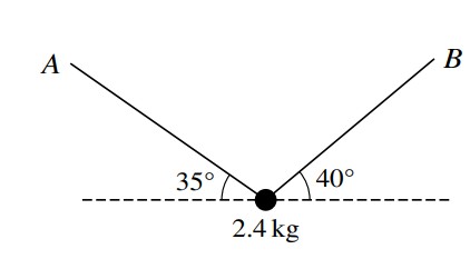 A particle of mass is held in equilibrium by two light inextensible strings, one of which is attached to point A and the other attached to point B. The strings make angles of and with the horizontal (see diagram). Find the tension in each of the two strings.