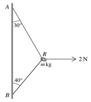 acts on R. The ends of the string are attached to fixed points A and B on a vertical wall. The part AR of the string makes an angle of
