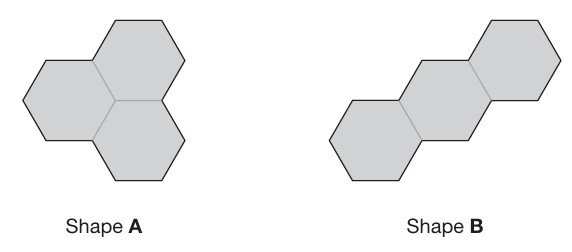 All the hexagons in this question are the same size. Each side of a hexagon is long. I put three hexagons together to make different shapes.