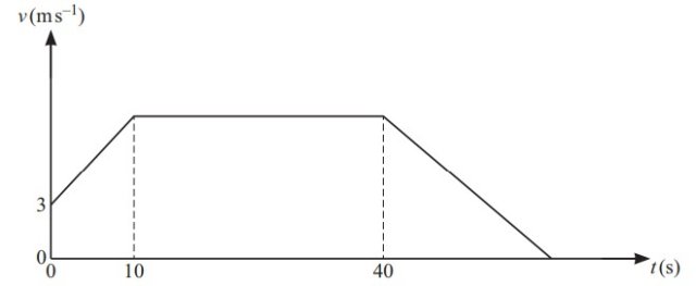 The diagram shows the velocity-time graph of the motion of a cyclist. The graph consists of three straight line segments. The cyclist passes a point O with speed and then accelerates for with constant acceleration . He then travels at constant speed for before decelerating, coming to rest at point P, covering a distance of whilst decelerating. Find the total time taken for the journey from O to P.
