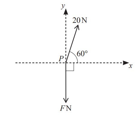 Two forces of magnitudes and act at a point P in the directions shown in the diagram. Given that the resultant force has no component in the y-direction, calculate the value of .