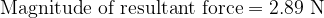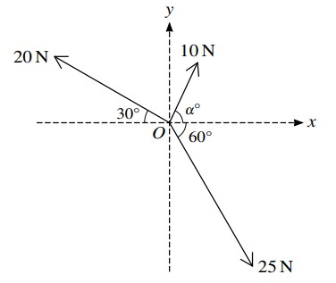 Three coplanar forces of magnitudes , and act at a point O in the directions shown in the diagram. Given that the component of the resultant force in the x-direction is zero, find , and hence find the magnitude of the resultant force.
