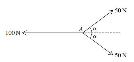 Three coplanar forces of magnitudes , and act at a point A, as shown in the diagram. The value of is . Find the magnitude of the resultant of the three forces and state its direction.