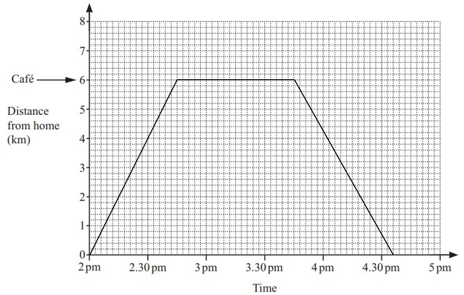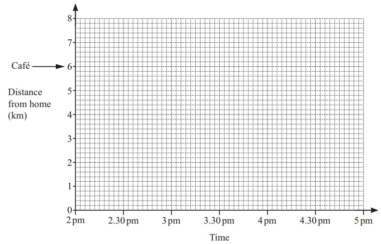 Samir leaves home at 2 pm. He jogs to a café at a constant speed of per hour. He stops to rest for 1 hour. He then walks back home at a constant speed and arrives at 4.36 pm. On the grid, draw a travel graph to show Samir’s whole journey.