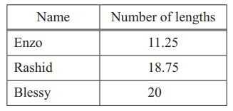 Enzo, Rashid and Blessy each swim as many lengths of a swimming pool as they can in 15 minutes. The results are shown in the table.