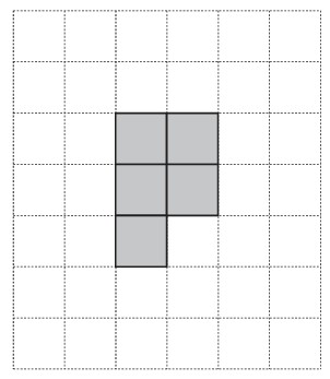 Look at the square grid. Five squares are shaded to make a shape. The shape has no lines of symmetry.