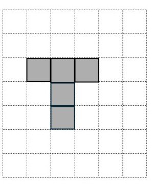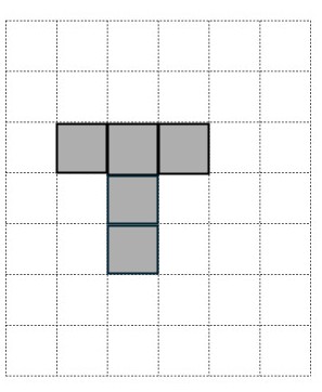 On the grid below, shade five squares to make a different shape. The shape must have exactly one line of symmetry.