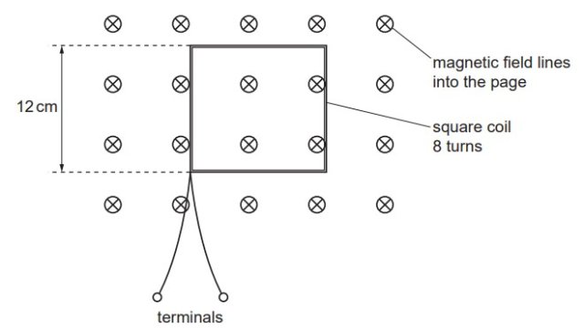 consists of 8 insulated turns. The coil is stationary in a uniform magnetic field. The plane of the coil is perpendicular to the magnetic field, as shown in the figure below.