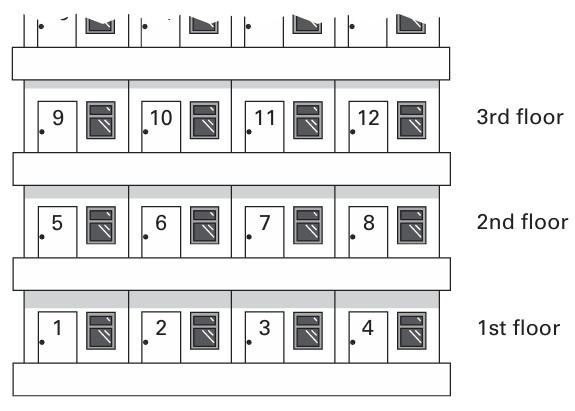 The diagram shows part of a block of flats. There are four flats on each floor.