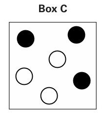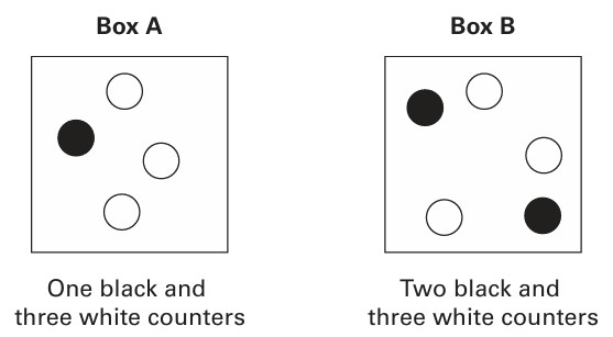 I am going to take a counter from box C without looking. It is just as likely that I will get a white counter as a black counter. Show what counters might be in box C.