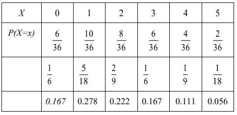 Two fair 6-sided dice with faces labelled 1, 2, 3, 4, 5, 6 are thrown. The two scores are noted. The random variable