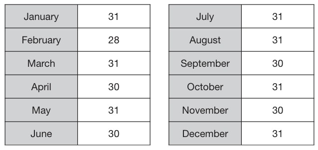 The tables below show the number of days in each month in the year 2006.