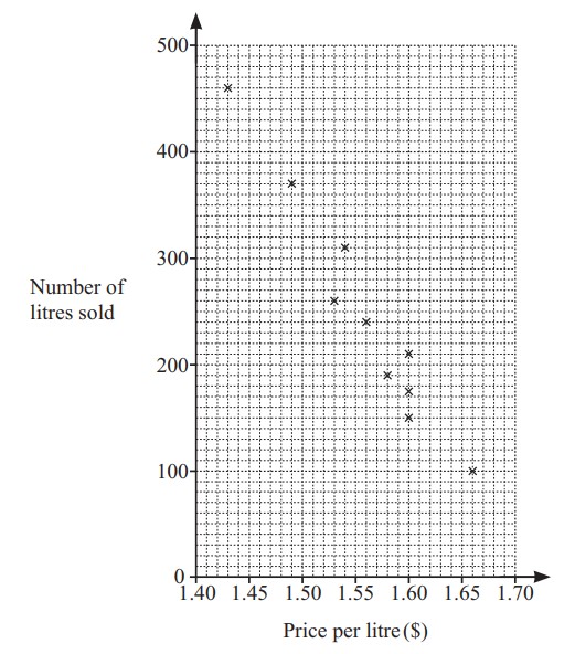 The scatter diagram shows the price of petrol per litre and the number of litres sold at a petrol station on each of ten days.