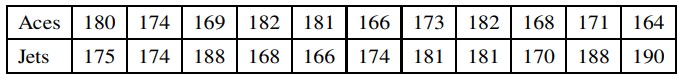 , of the 11 players in each of two teams, the Aces and the Jets, are shown in the following table.