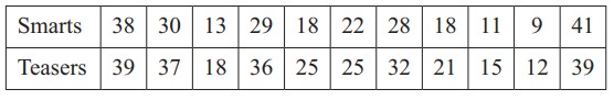 The Smarts and the Teasers are two quiz teams that each contain 11 members. Both complete a puzzle and the following table gives the times taken, in minutes, by the members of each team.