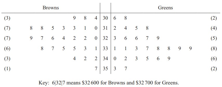 The back-to-back stem-and-leaf diagram shows the annual salaries, in dollars, of 27 employees at each of two companies, Browns and Greens.