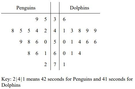 The times taken, in seconds, by 15 members of each of two swimming clubs, the Penguins and the Dolphins, to swim 50 metres are shown in the following table.