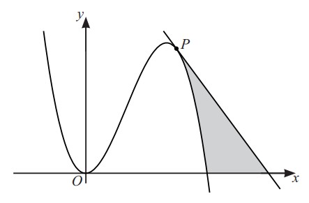 and the tangent to the curve at the point P. The point P has x-coordinate 3. The graph of