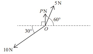 Three coplanar forces of magnitudes , and act at a point O, as shown in the diagram. The resultant of the three forces has magnitude and acts in a direction perpendicular to the force of magnitude . Find the value of and the value of .