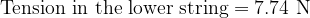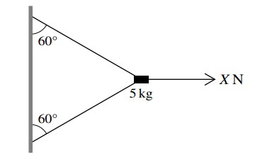 A block of mass is held in equilibrium near a vertical wall by two light strings and a horizontal force of magnitude , as shown in the diagram. The two strings are both inclined at to the vertical. Given that , find the tension in the lower string.